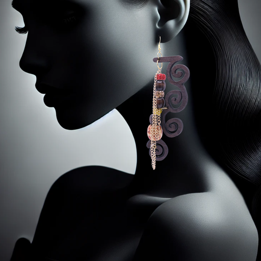 Ultra-Glamorous Wooden, chain and beaded earrings - E341-2